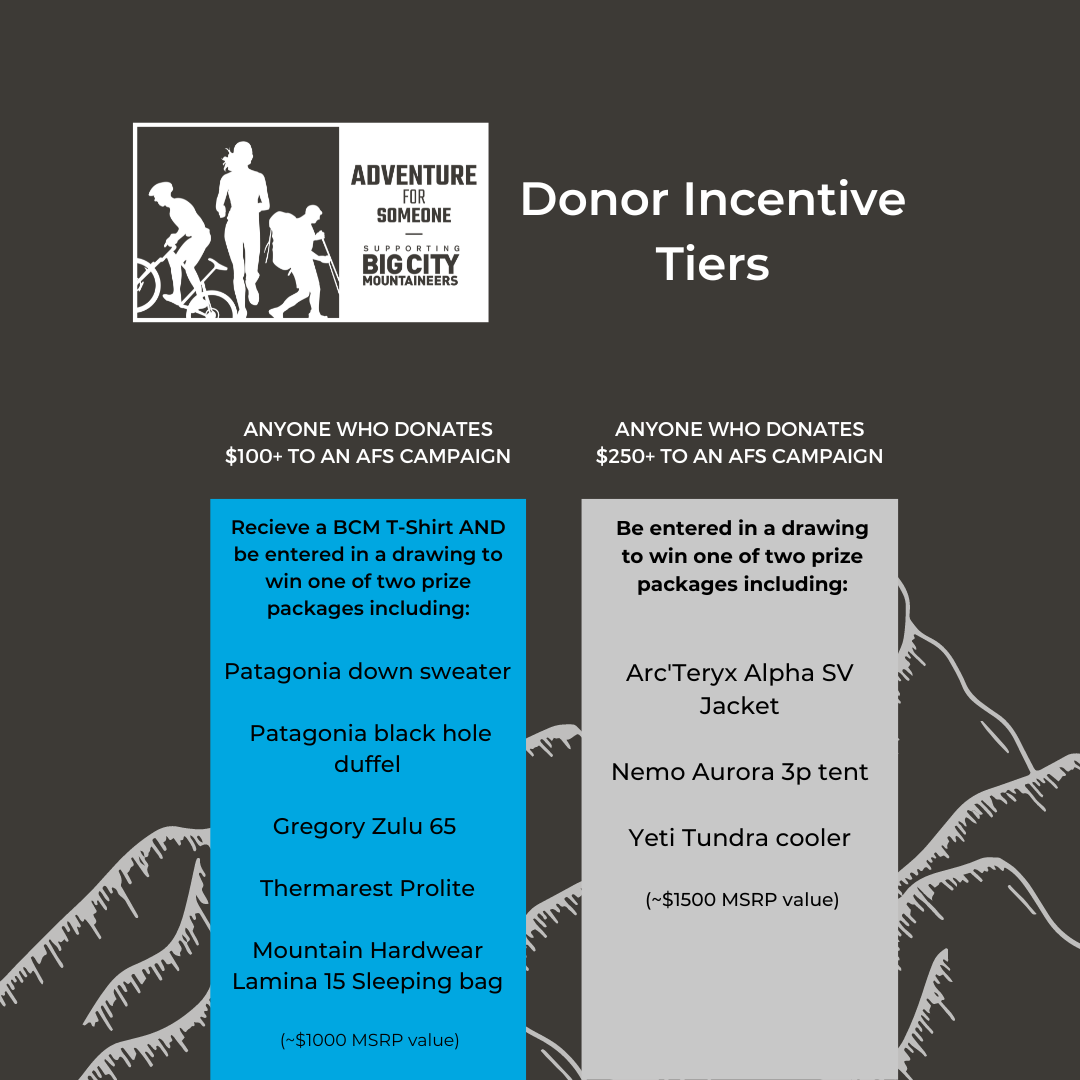 This year, BCM is excited to show our appreciation to adventurers through a new incentive tier program. Depending on the amount of money an AFS campaign has raised by 9/1/2023, campaigners will qualify for top of the line of gear and swag. At the highest level of participation, AFSers will be able to access the iconic Summit for Someone style experiences that the BCM community celebrates and loves! Additionally, donors to AFS campaigns of their choosing will also have a chance to receive some cool swag. Check out the initial release of our 2023 incentives below: